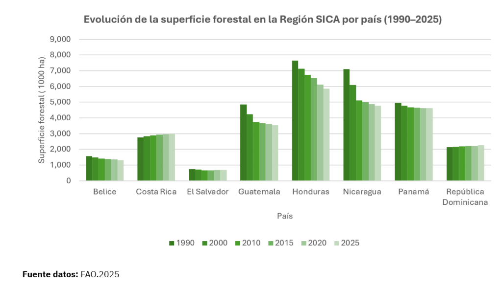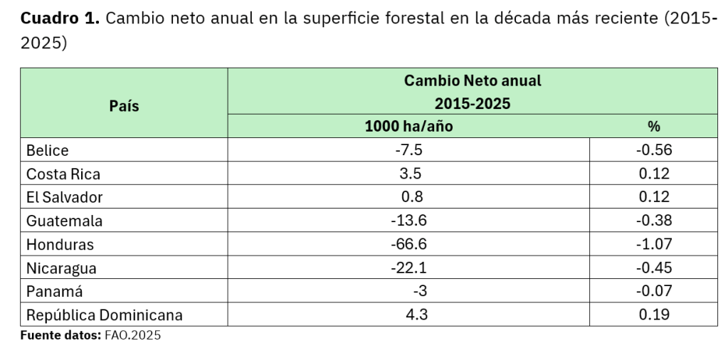El cuadro 1 evidencia una marcada heterogeneidad en el desempeño forestal de los países de la Región SICA durante el período 2015–2025, con un balance regional aún negativo, pese a la presencia de casos puntuales de recuperación neta.