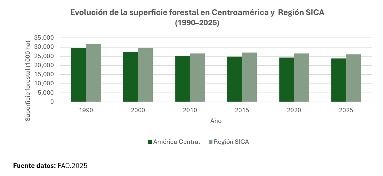 En la Región SICA, la superficie forestal pasa de 31,758 a 26,040 miles de hectáreas, equivalente a una reducción aproximada del 18 %. La trayectoria evidencia que la dinámica regional está dominada por las tendencias centroamericanas, sin efectos compensatorios suficientes de los demás países miembros.