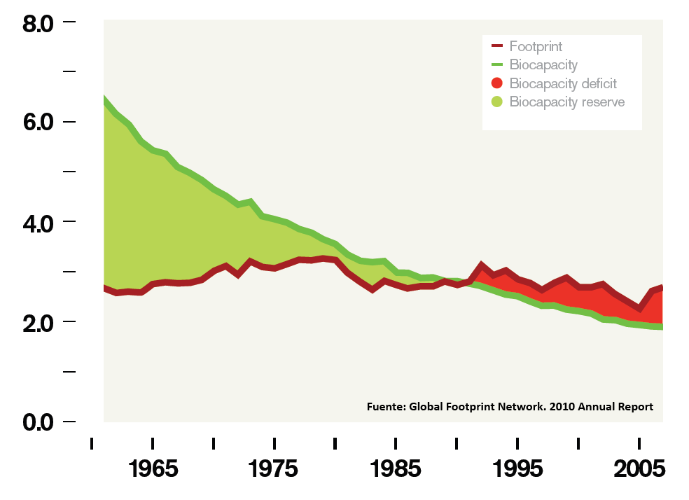 Costa Rica aproximadamente desde el año 1993 según el Informe de la Organización Global Footprint Network (2010) sobrepaso su biocapacidad (Figura anterior), esto significa que el país para sobrevivir importa recursos, esta agotando sus propias reservas y asi contribuye cada vez más con emisiones de carbono que van a la atmósfera y los océanos.