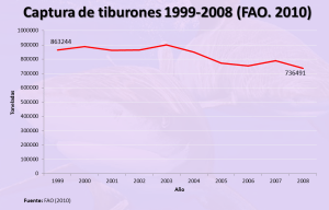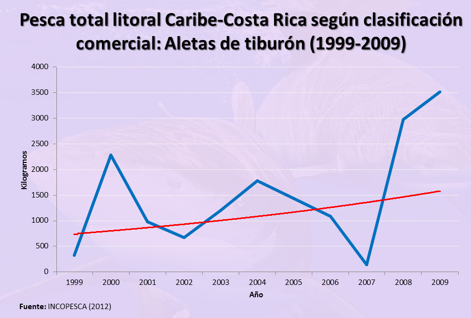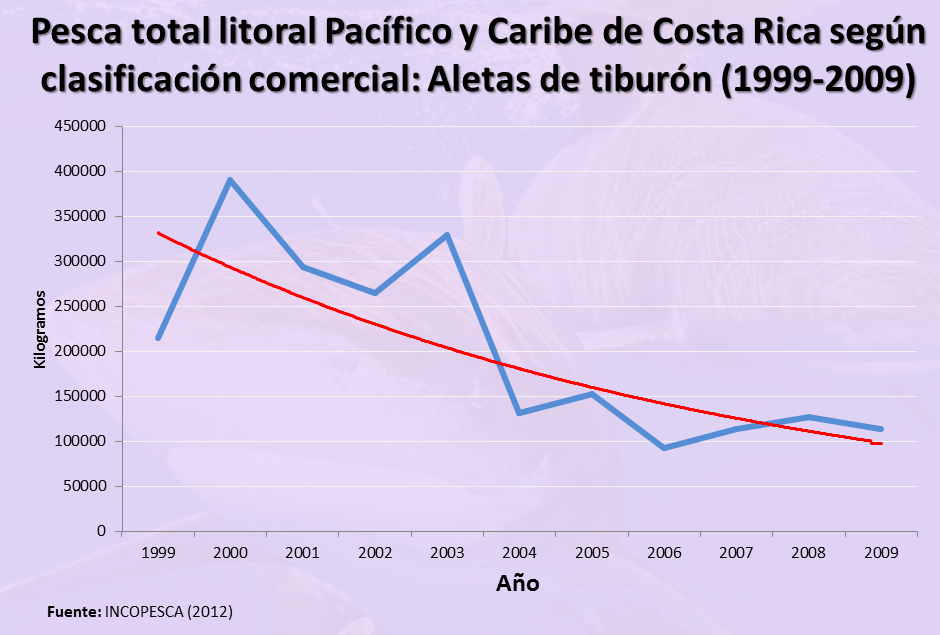 A nivel de Costa Rica si solo graficamos la pesca total de aletas de tiburón basado en las estadísticas de INCOPESCA entre el año 1999 y el 2009 sumando ambos litorales encontramos una clara disminución en los desembarques lo que puede indicar no necesariamente que el nivel de esfuerzo ha disminuido sino que podrían haber problemas con la disponibilidad del recurso.