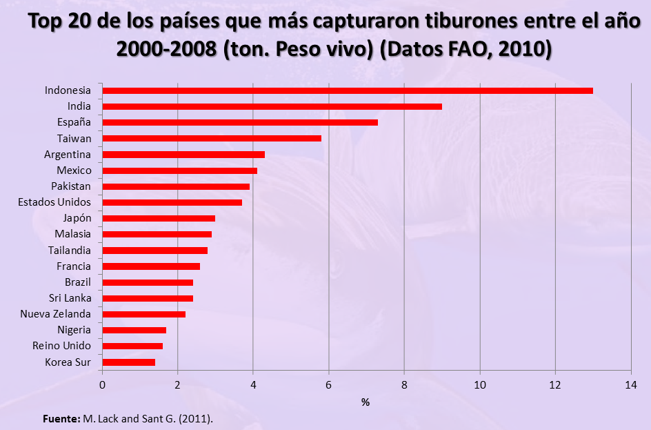 Las capturas mundiales de tiburones están dominadas en casi un por 80% por  Indonesia e  India, mientras que España y Taiwán representan más del 35%. El futuro de muchas poblaciones de tiburones está esencialmente en manos de la lista del Top 20 mostrado en la figura. Un indicador del compromiso con la gestión para la conservación de los tiburones en el Top 20 es si los países tienen e implementan un Plan de acción para la conservación y gestión de las poblaciones de tiburones. En la actualidad, 13 del Top 20 se sabe que tienen un Plan de Acción Nacional, lo que se desconoce es el resultado de su implementación. (M. Lack and Sant G. 2011).