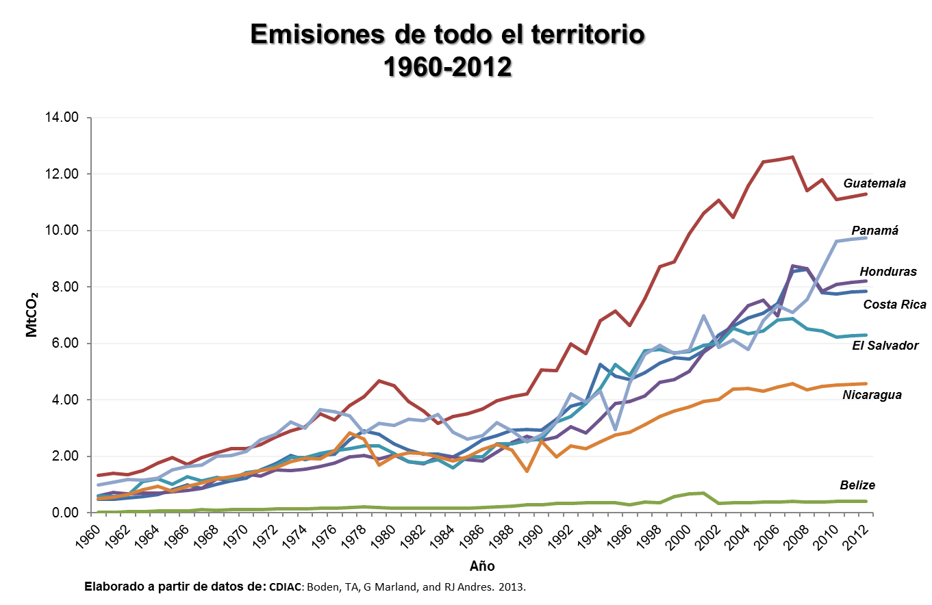 Entre 1960 y el 2012 todos los países de la región Centroamericana han venido incrementado las emisiones totales siendo Guatemala, Panamá, Honduras y Costa Rica los de más rápido crecimiento seguidos de El Salvador, Nicaragua y Belice.