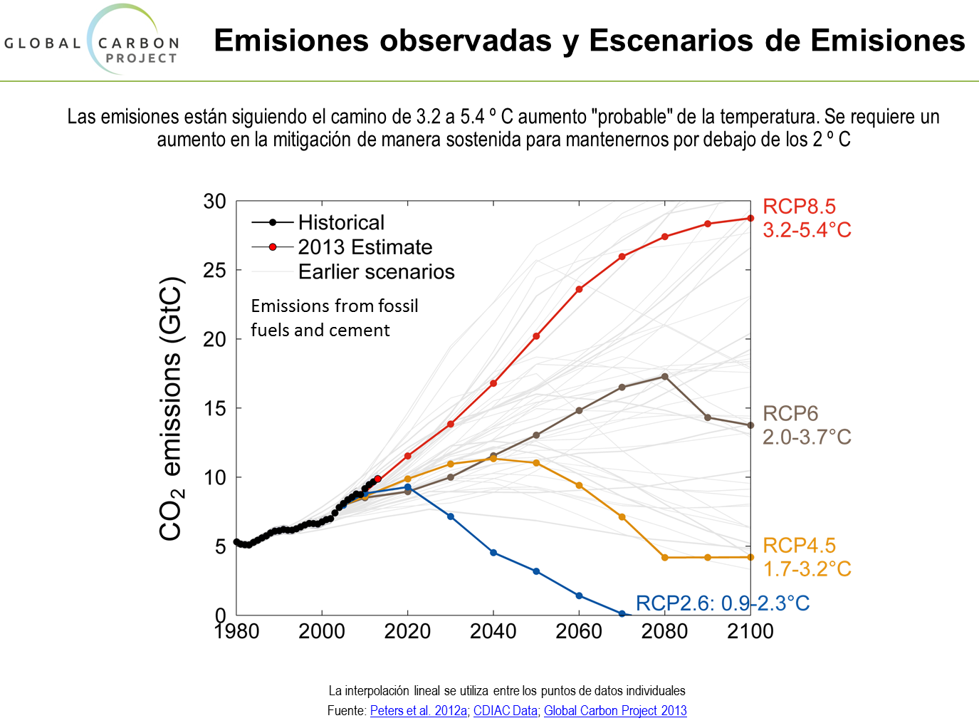 La trayectoria actual de las emisiones de combustibles fósiles está siguiendo el escenario de emisiones más intensivo en emisiones del carbono de los escenarios de emisiones publicados por el Grupo Intergubernamental de Expertos sobre el Cambio Climático (IPCC) en 2013. La trayectoria actual está siguiendo el Camino que representa la concentración 8.5 (la última familia de escenarios del IPCC) que lleva a la temperatura media del planeta a cerca de 3,2 ° C a 5,4 ° C por encima de la era pre-industrial para el año 2100 (TGCP.2013).