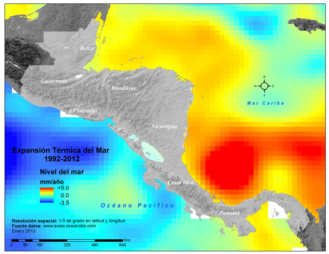 En síntesis, se concluye que en el período 1992-2012 ha existido una tendencia positiva de aumento del nivel del mar en la costa del Caribe cercana a la tendencia global, que es de 3,26 mm/año (Beckley et al., 2014), mientras que en la costa del Pacífico se observa una disminución (Protti et al., 2010).
