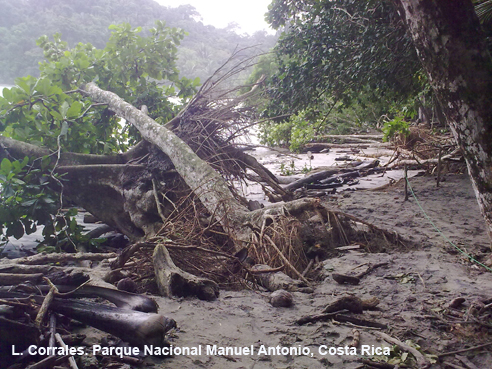 PNManuel Antonio_QueposOtro de los fenómenos que puede ocasionar problemas a las poblaciones es el causado por las tormentas lejanas y/o locales, que provocan el apilamiento del oleaje, las cuales, sumadas a un período de marea alta, podrían provocar inundaciones (Lizano y Lizano, 2010), como sucedió recientemente en la zona de Caldera en el golfo de Nicoya (The Tico Times, 2014), o provocar eventos más extremos, como el aumento del nivel del mar por un tsunami: el ocurrido en Japón en 2011 hizo que en Quepos el nivel del mar subiera 18 cm, según datos del Centro de Alerta de Maremotos del Pacífico (Lizano y Lizano, 2010). Todo lo anterior en el Pacífico, y en el litoral Caribe habría que agregar los efectos directos e indirectos de los ciclones tropicales, frecuentes anualmente.